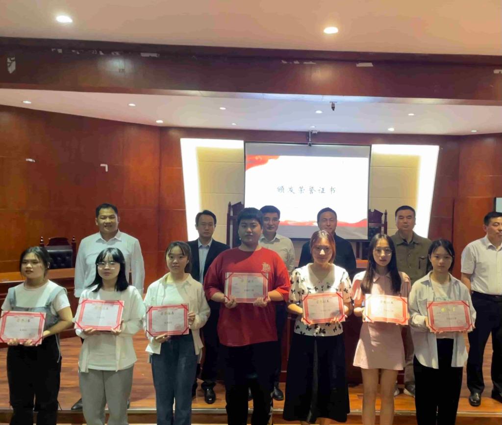 伴随音乐响起,各位领导为先进团组织与优秀个人颁发荣誉证书并进行合照留影。