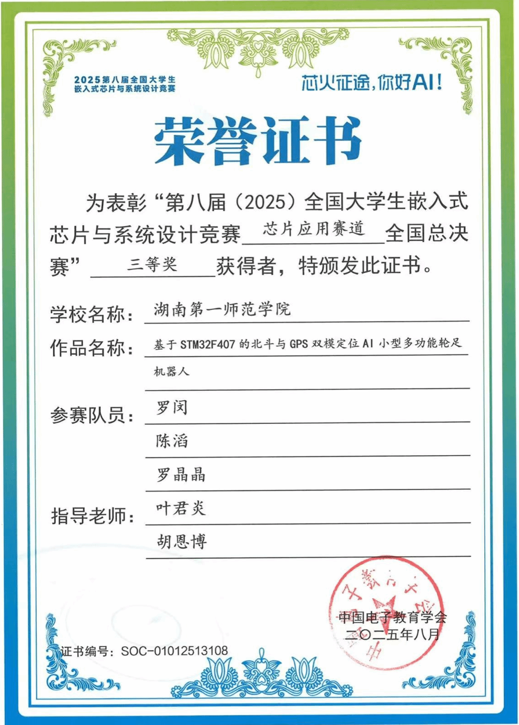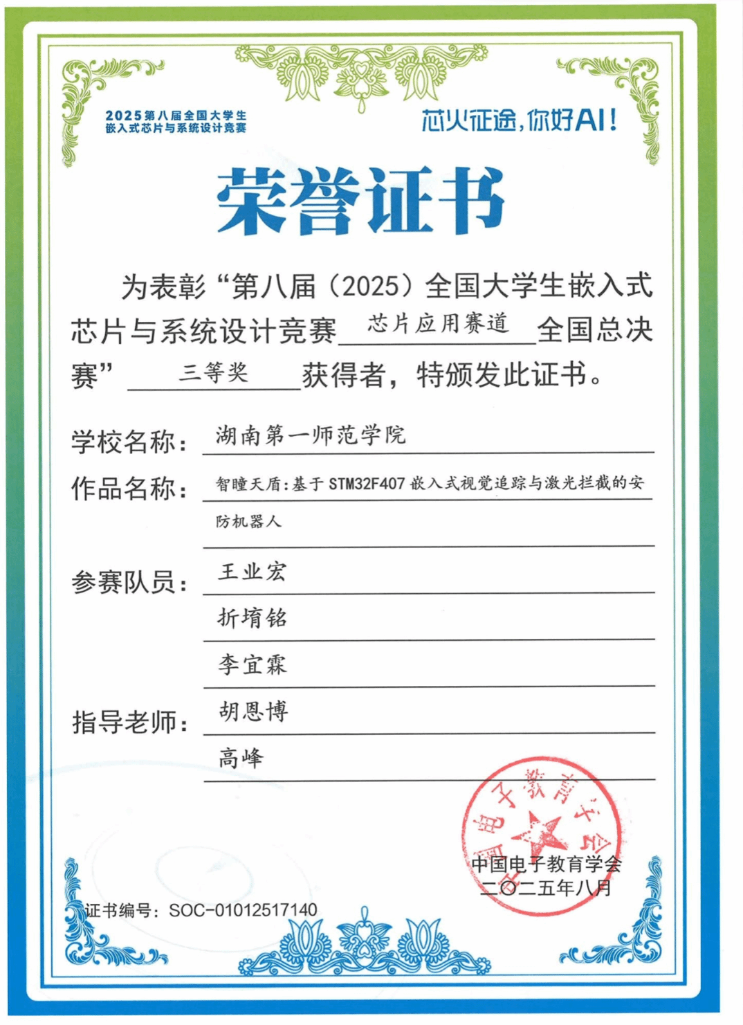近日,第八届(2025)全国大学生嵌入式芯片与系统设计竞赛评审结果公布,我院学生获全国三等奖2项、中部赛区一等奖2项,二等奖3项,三等奖4项。其中王业宏、罗明、李宜霖组及罗闵、陈滔、罗晶晶组获全国三等奖,为我校首次获该项赛事国奖。