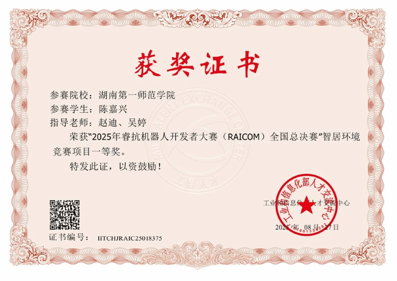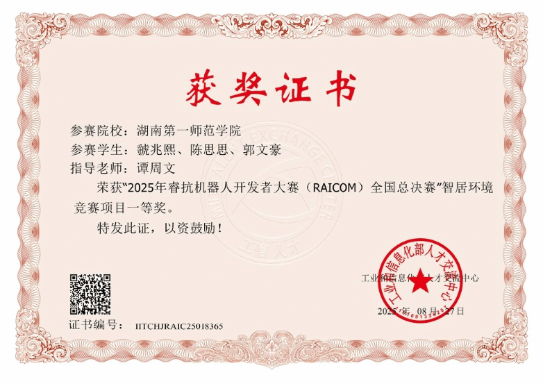 近日, 2025年睿抗机器人开发者大赛(RAICOM)全国总决赛评审结果公布,我院学子获全国一等奖2项、二等奖3项、三等奖4项,总计9项全国奖的优异成绩。其中陈嘉兴组及虢兆熙组获全国一等奖。