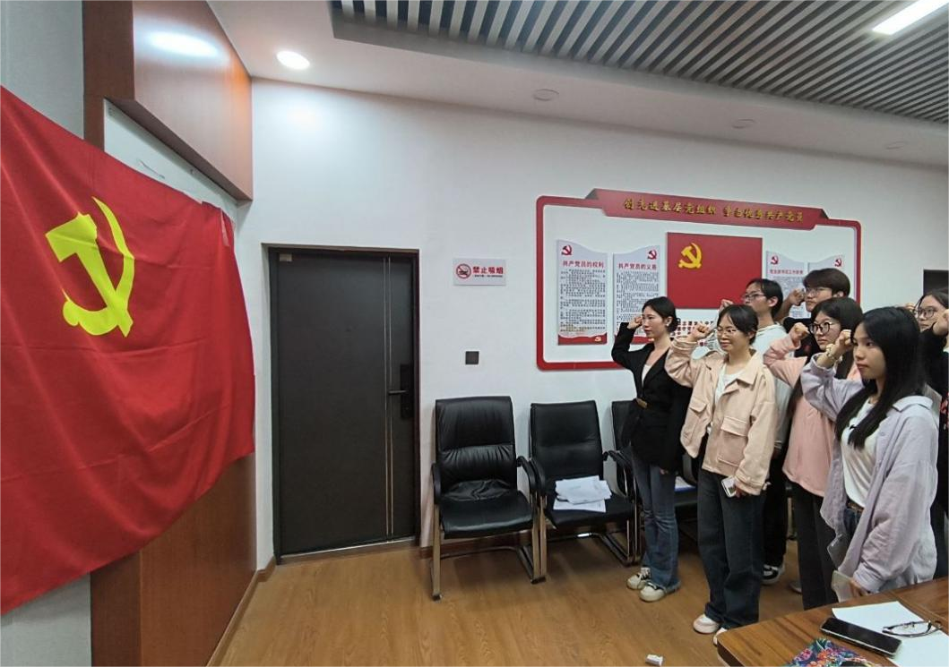 会议第八项,发展对象面向党旗宣誓。本期发展对象在正式党员的带领下,面向党旗,慷慨激昂的读出了入党誓词。