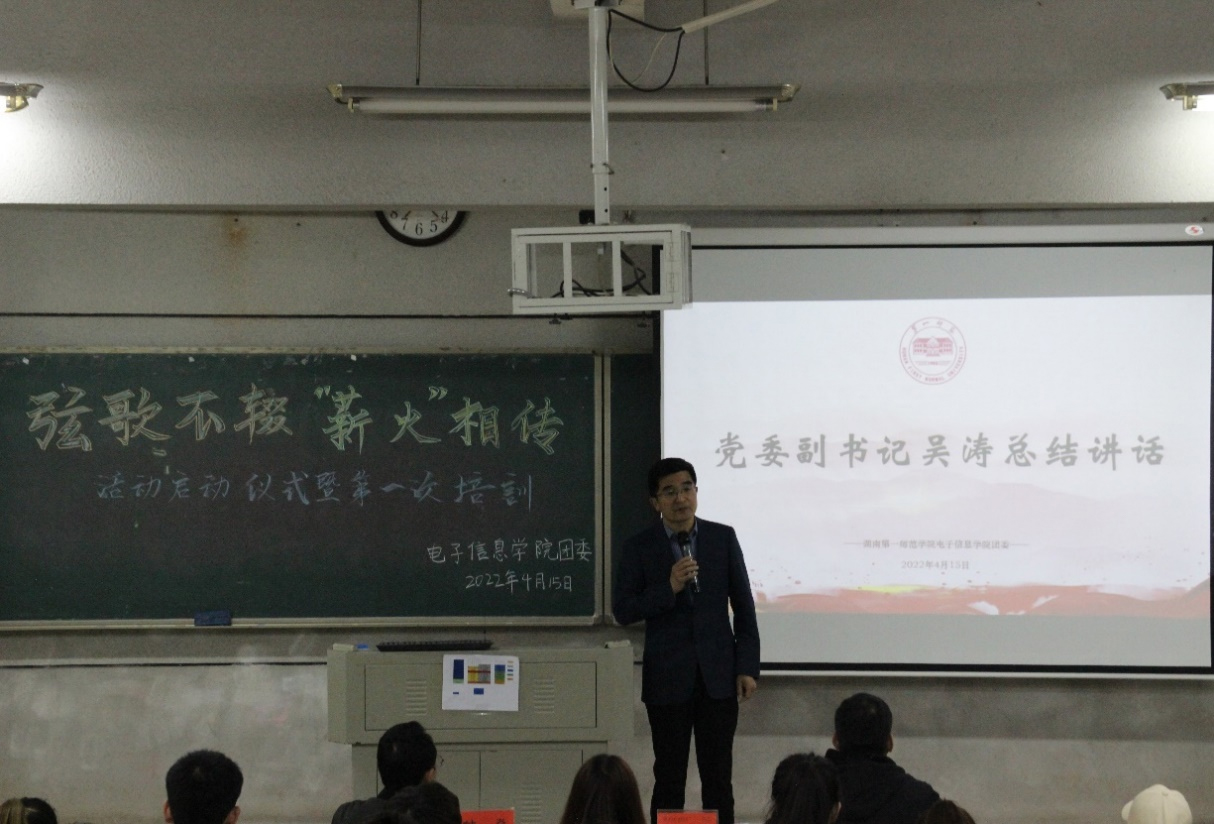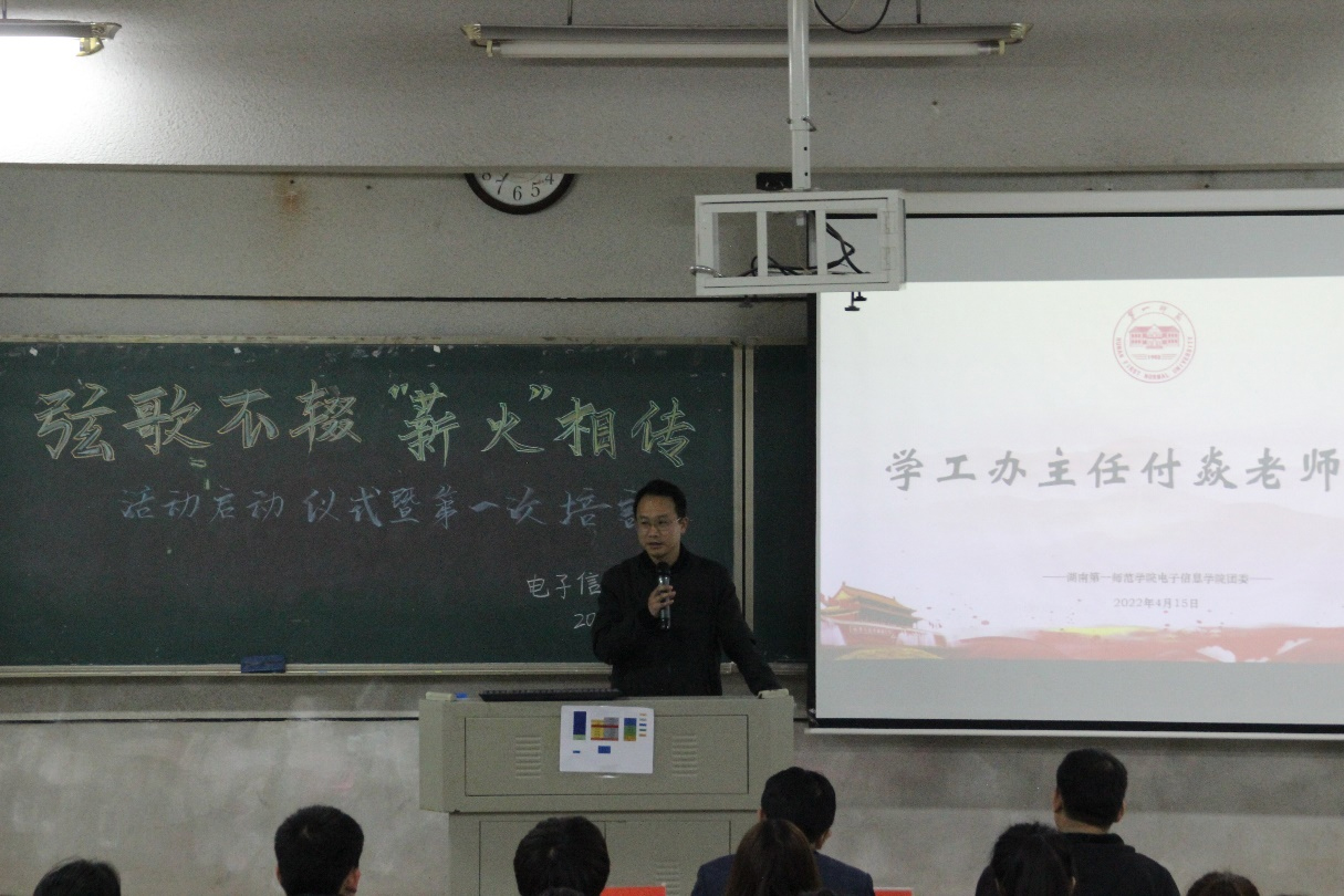 2022年4月15日晚上19点,我院于润寰南101举办以“弦歌不辍,薪火相传”为主题的“薪火”学生骨干培养工程启动仪式暨第一次培训。伟德国际victor1946党委副书记吴涛老师、学工办主任付焱老师、团委书记李荣敬老师出席了本次启动仪式,2021-2022届学生干部及志愿者们参与了学习培训。