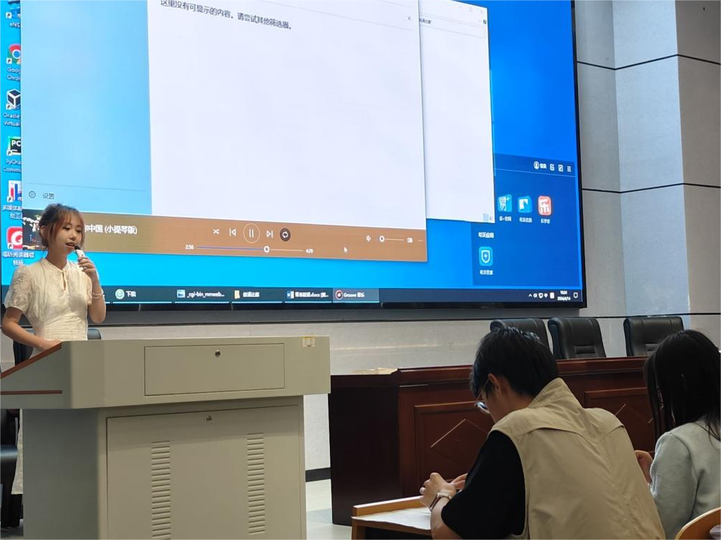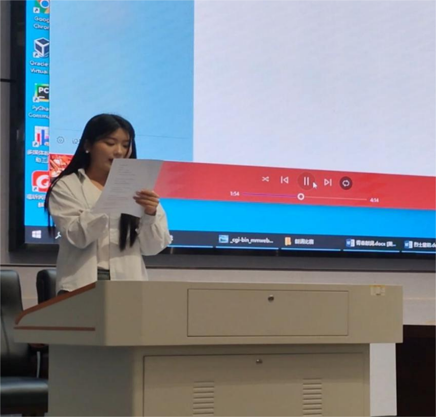 紧接着主持人介绍入围决赛选手,宣布比赛正式开始。在比赛现场,龙雨婕朗诵的作品《诗意中国》,尤为突出。其朗诵优雅婉转,让人沉醉于文字的意境之中。