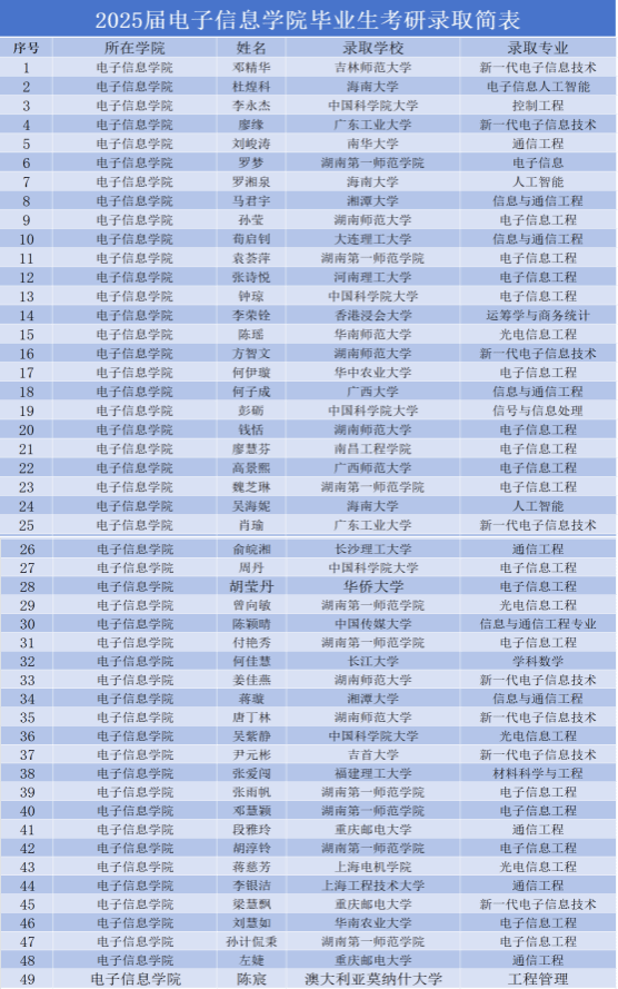 我院2025届毕业生考研升学工作取得历史性突破,实现了考研升学人数以及升学质量上显著提升,充分彰显了学院人才培养工作的高质量产出。学院2025届本科毕业生共计179人,报考硕士研究生人数达107人,报考率为59.7%,充分展现了学生群体积极向上、追求卓越的求学热情。共有49名学子成功被国内外知名高校录取,录取率达27.3%,创学院历史新高,更有5名学生考入中国科学院大学。录取院校涵盖大连理工大学、中国科学院大学、中国传媒大学、湖南师范大学、香港浸会大学、澳大利亚莫拉什大学等多所重点学府。