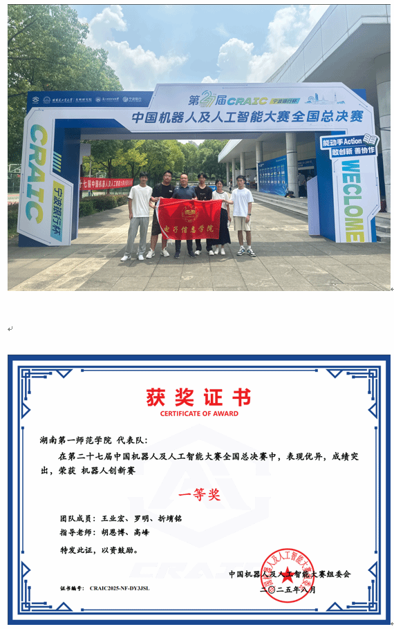 近日,2025年第27届中国机器人及人工智能大赛(CRAIC)全国决赛评审结果公布,我院学生获全国一等奖2项、二等奖1项、三等奖3项、优胜奖3项。其中,由朱俊豪、刘冠湘、蒋雨希所组成的队伍,以及由王业宏、罗明、折堉铭所组成的队伍,均荣获全国一等奖。