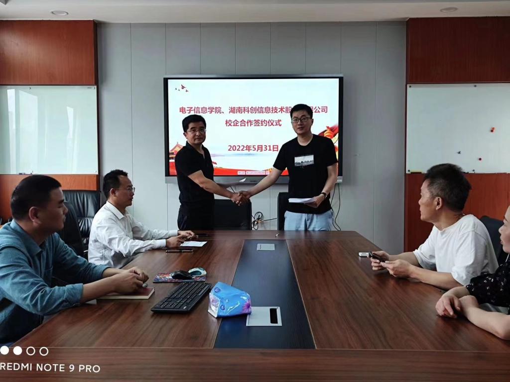 为进一步贯彻落实学校“新时代、新师范、新使命”办学新理念、服务“强师计划”和“强省会战略”,2022年5月31日上午11:00,在学校玉衡北302会议室,伟德国际victor1946与湖南科创信息技术股份有限公司签订校企合作协议。双方在人才培养、技术研发、实习实训、学生就业等达成广泛合作意向,这是电信院落实学校办学新理念,服务区域经济发展的实际行动。学院将进一步加强开展校企合作,深化人才培养、学科建设、科学研究新模式新路径,努力开创新工科建设大好局面。