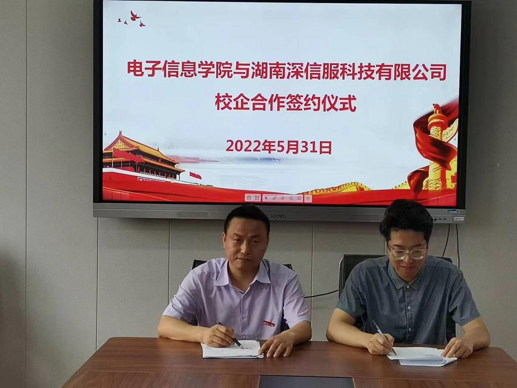 我院与湖南深信服科技有限公司签订校企合作协议 作者: 发布时间:2022-06-02 点击数: 为进一步贯彻落实学校“新时代、新师范、新使命”办学新理念、服务“强师计划”和“强省会战略”,2022年5月31日上午10:30,在学校玉衡北302会议室,伟德国际victor1946与湖南深信服科技有限公司签订校企合作协议。双方围绕我校办学新理念,对接区域产业经济发展需求,在技术研发、人才培养、实习实训、学生就业等方面广泛开展合作,实现人才培养协同育人,技术研发与项目联合开发的"双赢校企合作"模式。