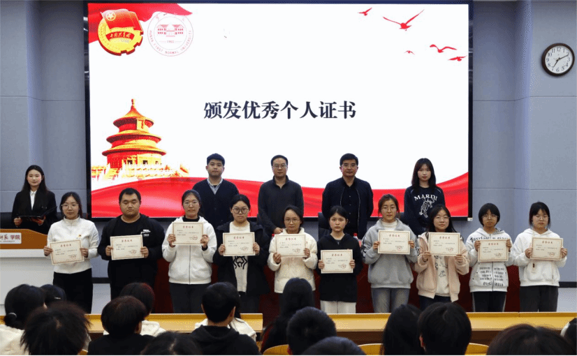 为全面贯彻党的教育方针,表彰先进典型,弘扬优良学风,激励学生勤奋学习、奋发图强,加强校风学风建设,营造争先创优的良好氛围,我院于2025年3月20日晚7点润寰南105报告厅召开2023-2024学年先进班集体、优秀个人表彰大会暨2024-2025学年度上学期表彰大会。院党委书记吴涛、学工办主任余亮、学生党支部书记姚瑶、团委书记谭炜及200余名师生代表出席本次大会。