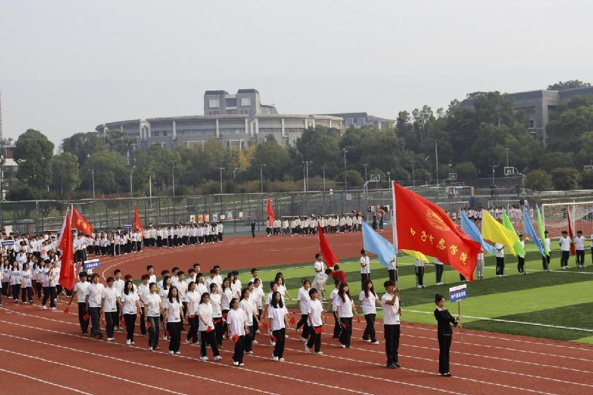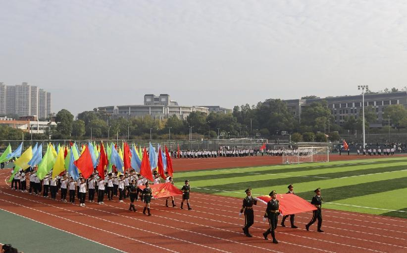 入场式结束后,五星红旗伴随国歌冉冉升起,全体师生行注目礼。随后胡穗校长发表开幕致辞,强调体育运动对学生身心健康的重要性,鼓励同学们发扬拼搏精神,并预祝运动会成功。